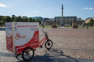 Kunden der memo AG in der Innenstadt von Stuttgart werden seit Juli 2018 mit Elektrolastenrädern der Velocarrier GmbH beliefert. (Copyright: Velocarrier GmbH)